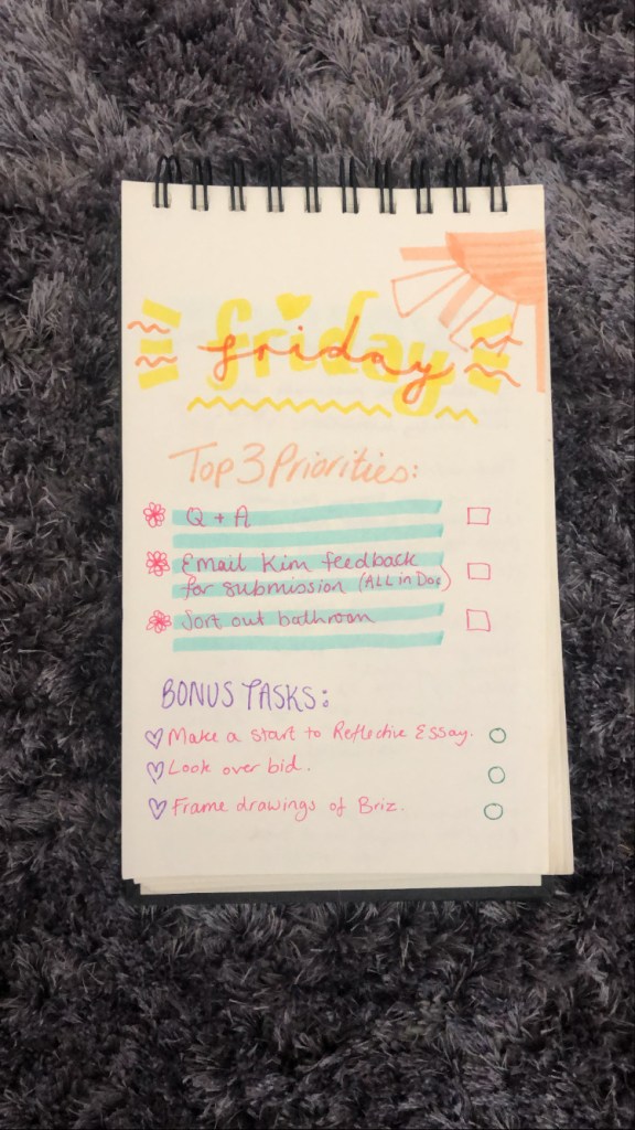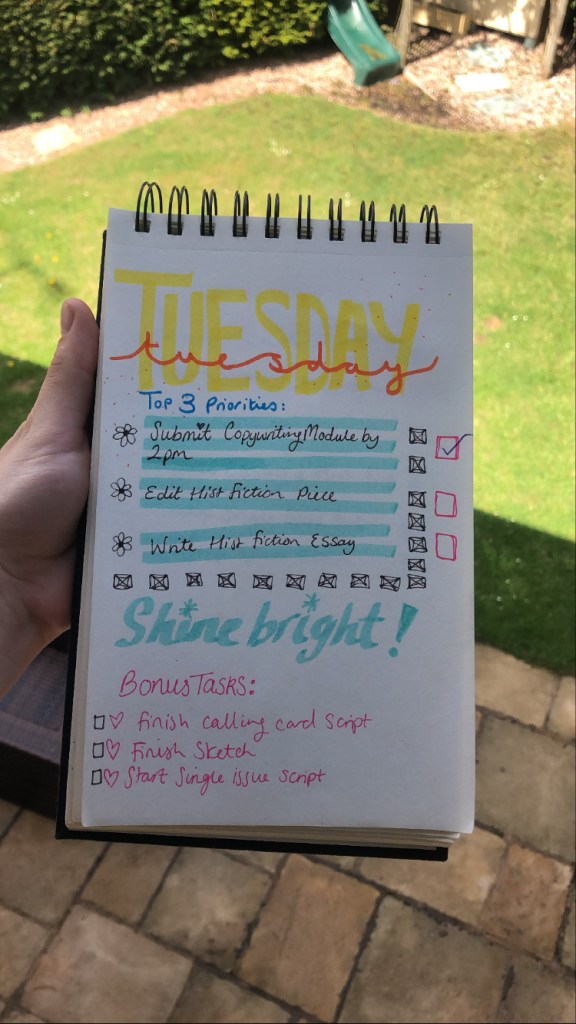 Of course, we have all of this new-found time for studying and dedicating ourselves to our degree but remember to look after yourself. Don’t put too much pressure on yourself to work 24/7, be realistic and think about what you would be doing if you were actually in university. This is why priority lists have worked for me, as they split the day up for me.