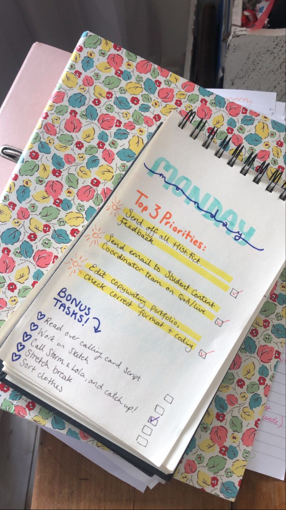 I also give myself bonus tasks – these are a few extra goals that I could get done if I have enough time. These tasks are what they sound like – a BONUS, they are non-essential and it doesn’t matter if they don’t get completed.